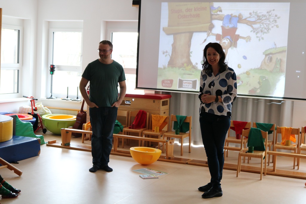 In der Vorbereitungszeit auf Ostern erlernten wir zum Bilderbuch „Stups, der kleine Osterhase“ auch das gleichnamige Lied, wo die wichtigsten Schlüsselwörter wie „klein, Osterhase, Nase,…“ im Vorfeld schrittweise und für Kinder sehr lustbetont gemeinsam erarbeitet wurden. So konnten alle schließlich beim Lied aktiv mitmachen und erleben, wie Musik und Bewegung miteinander verbunden werden können.