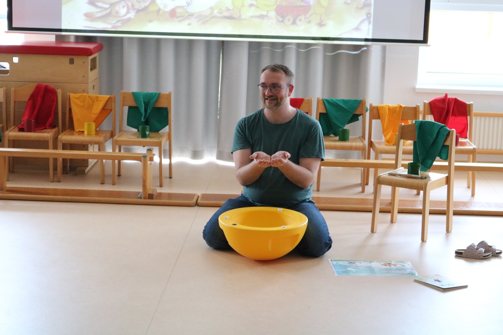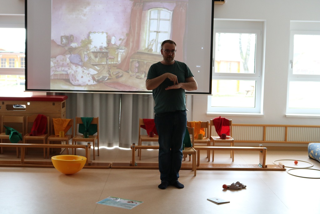Gemeinsam betrachteten wir die Bilder als Bilderbuchkino auf unserer Kinoleinwand im Bewegungsraum und sahen gleichzeitig die Gebärden von Pascal. Das war für die Kinder sehr spannend, denn Pascal zeigte mit seinen Händen, seiner Mimik und seinem ganzen Körper, wie Geschichten “mitgebärdet” werden können.
